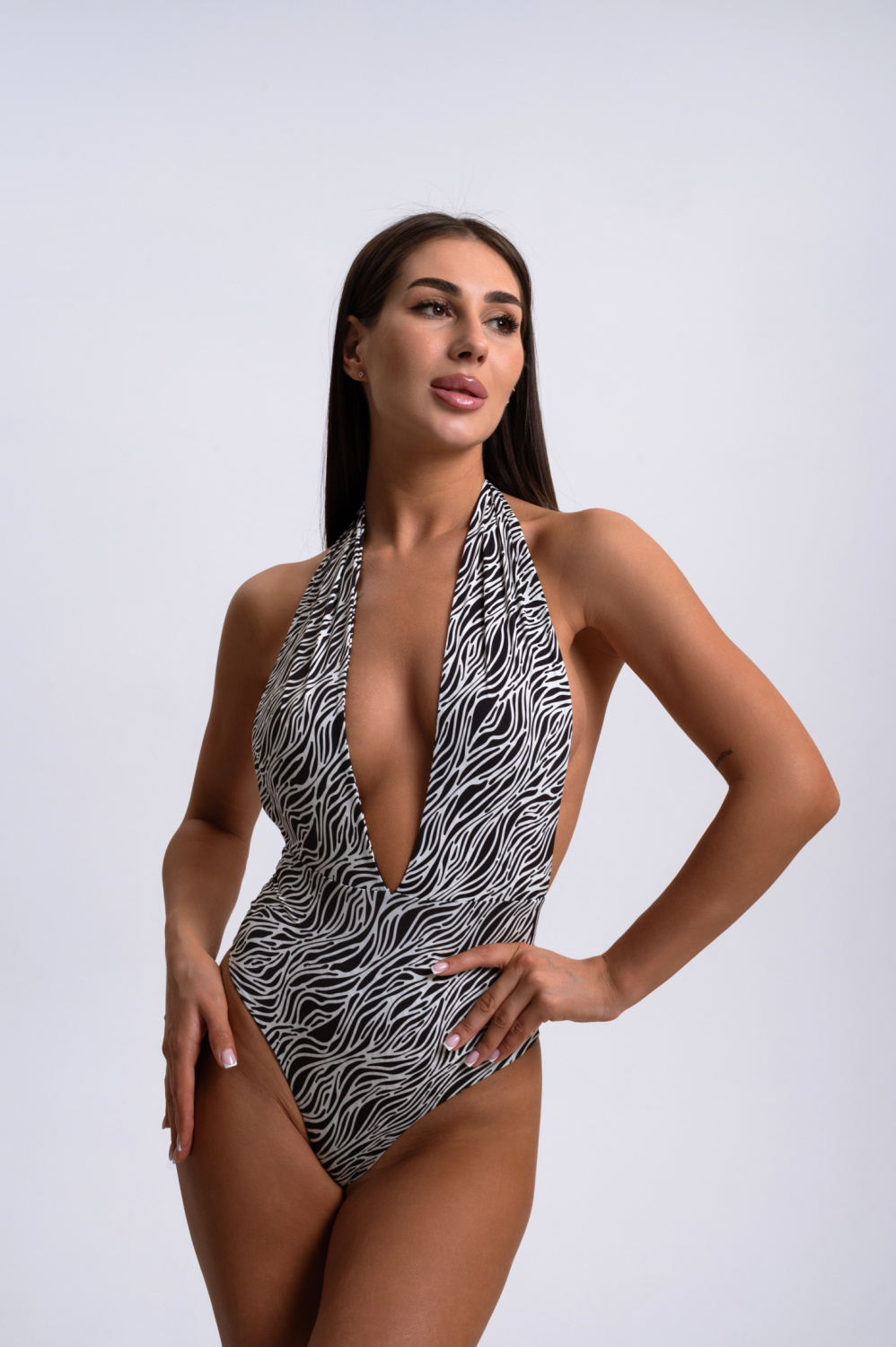Купальник на регулируемых бретелях на шее.
