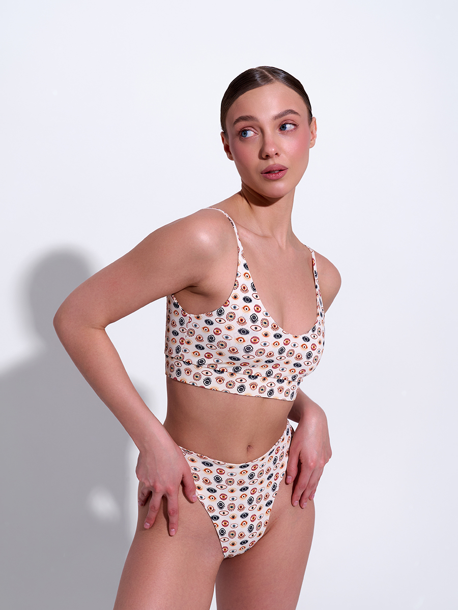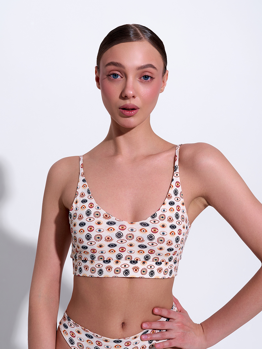 Топ двухслойный, с мягкими резинками в швах. Это обеспечивает дополнительную поддержку для груди и позволяет ему держать форму при намокании и не деформироваться после долгой носки и стирки.