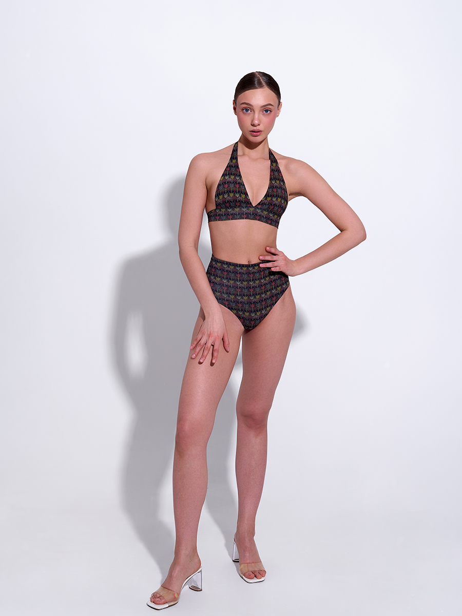 Топ двухслойный, с мягкими резинками в швах. Это обеспечивает дополнительную поддержку для груди и позволяет ему держать форму при намокании и не деформироваться после долгой носки и стирки.
